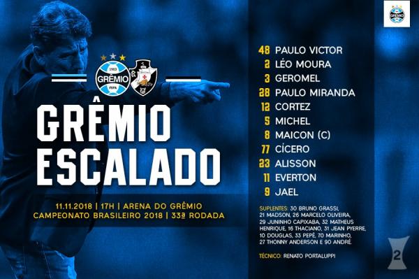 Veja a escalação do Grêmio para o jogo contra o Vasco