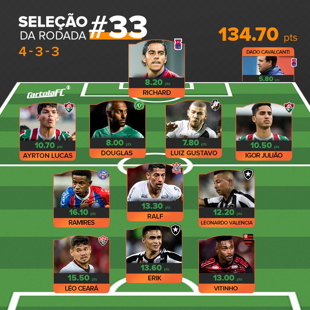 Bahia e Rio de Janeiro foram os destaques da seleção da rodada #33. Do clássico Ba-Vi vieram os mitos Ramires (Bahia) e Léo Ceará (Vitória). Dos quatro clubes cariocas vieram mais seis jogadores: Luiz Gustavo, do Vasco; Ayrton Lucas e Igor Julião, do Fluminense; Leonardo Valencia e Erik, do Botafogo; e Vitinho, do Flamengo. O Paraná, que venceu o América-MG fora de casa, também se destacou com o goleiro Richard e com o técnico Dado Cavalcanti.