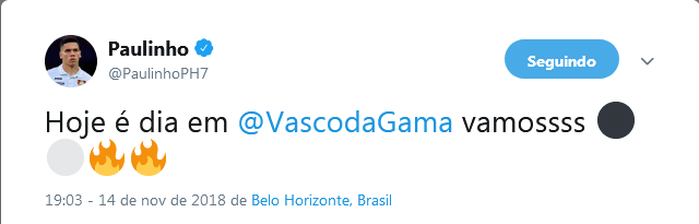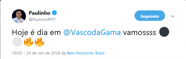 Paulinho, via Twitter: 'Hoje é dia de Vasco'