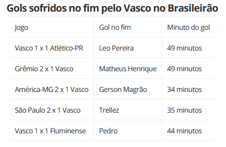 Ao todo, o Vasco deixou escapar sete pontos no Brasileirão com gols sofridos nos minutos finais das partidas. Um número que deixaria o Cruz-Maltino mais tranquilo no Campeonato Brasileiro. Veja a tabela: