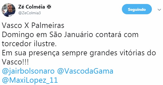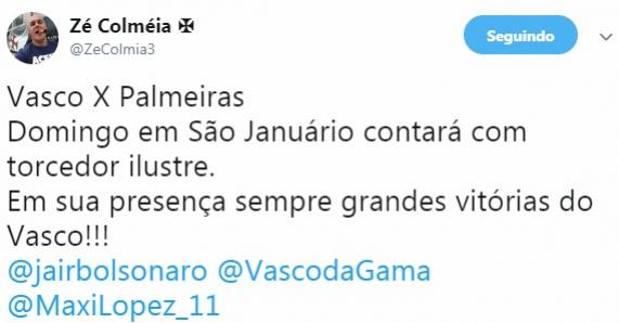 O sócio vascaíno Fernando Lima, o Zé Colmeia, publicou em seu Twitter uma foto do presidente eleito do Brasil, Jair Bolsonaro, com uma camisa autografada do Vasco. Na postagem, Zé Colmeia informa que Bolsonaro irá a São Januário assistir ao jogo Vasco x Palmeiras, marcado para o dia 25 de novembro, domingo. O Palmeiras, time do presidente eleito, está muito perto de conquistar o título brasileiro.