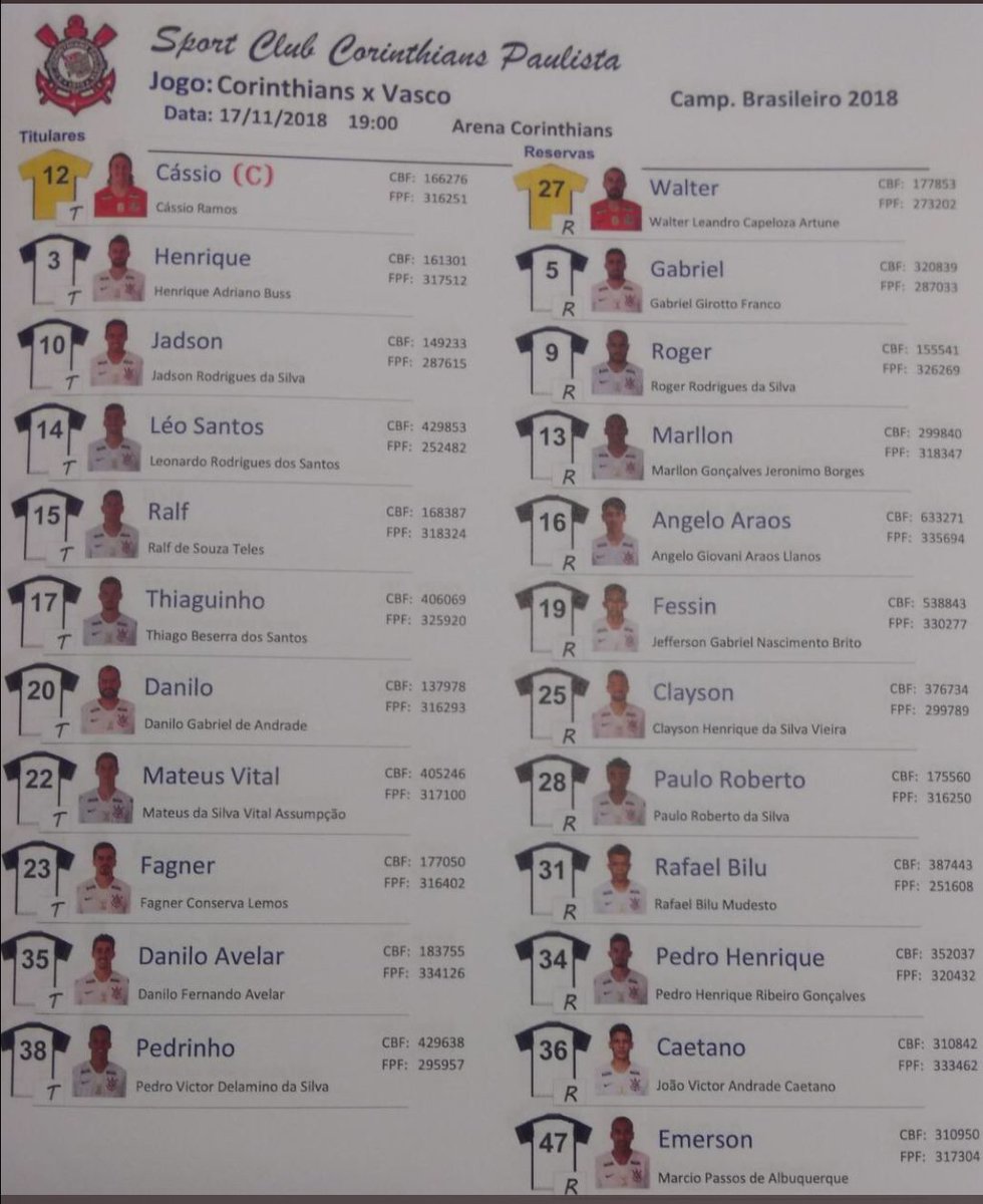 Desta forma, o Corinthians vai a campo às 19 horas (de Brasília) com Cássio; Fagner, Léo Santos, Henrique e Danilo Avelar; Ralf, Thiaguinho, Jadson, Mateus Vital e Pedrinho; Danilo.