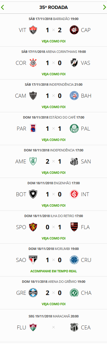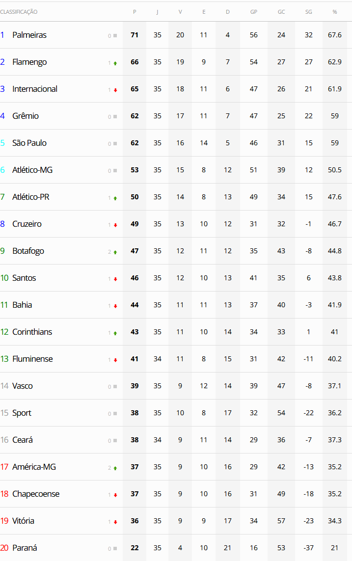 Os resultados dos jogos do fim de semana da 35ª rodada do Campeonato Brasileiro foram bons para o Vasco, que perdeu para o Corinthians por 1 a 0, mas continuou na 14ª colocação, a 2 pontos da zona de rebaixamento.