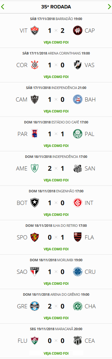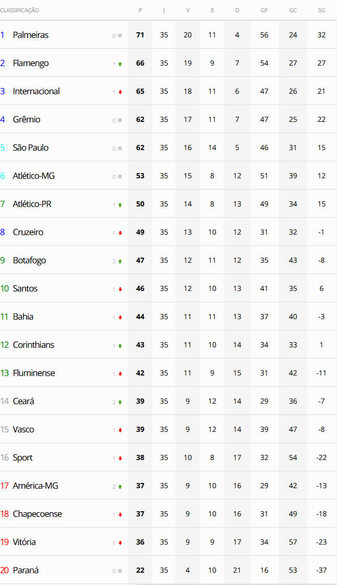 Terminada a 35ª rodada do Campeonato Brasileiro, o Vasco, que perdeu para o Corinthians por 1 a 0, caiu da 14ª para a 15ª posição na classificação. Já a diferença para a zona do rebaixamento segue em 2 pontos.