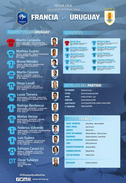 #FRAURU | Formación de @Uruguay para enfrentar a @equipedefrance a partir de las 21 h (FRA), 17 h (URU), en el Stade de France por fecha FIFA.