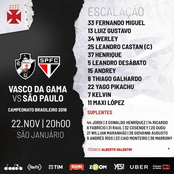 Confira escalação do Vasco; Luiz Gustavo, Werley e Maxi López voltam ao time