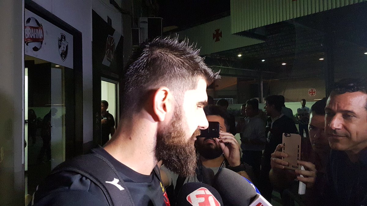 Fernando Miguel é o primeiro na zona mista do Vasco. O goleiro chegou aplaudido pelos torcedores aqui presentes #lanceCOLINA