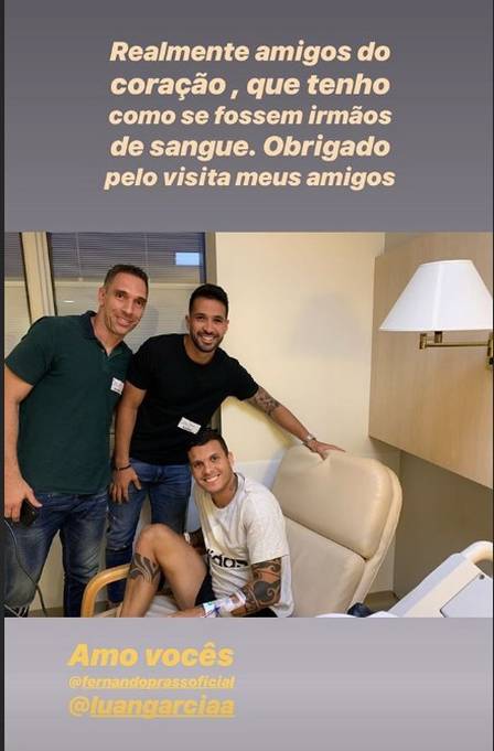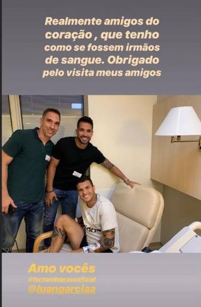 O lateral compartilhou imagens em seu Instagram Stories, inclusive uma visita de dois ex-companheiros de Vasco, que agora estão no Palmeiras, próximo rival do Gigante da Colina. O goleiro Fernando Prass e o zagueiro Luan foram até o hospital para ver o amigo e ex-colega.