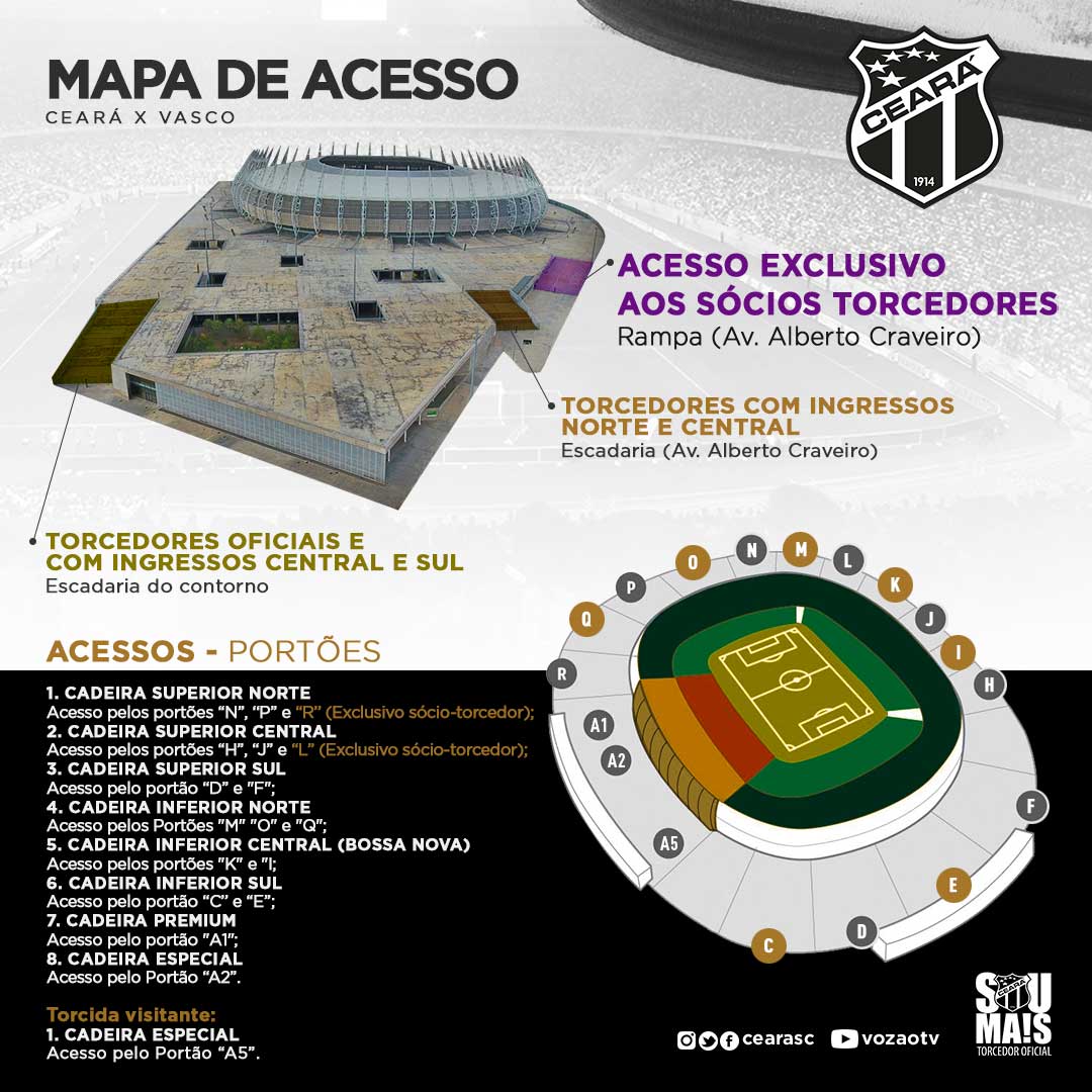 Respeitando a portaria do Ministério dos Esportes que obriga a setorização do estádio, o torcedor que for a Arena Castelão deve previamente escolher um setor para assistir ao jogo, não sendo permitida a passagem do setor escolhido para outro local do estádio. Portanto, confira atentamente os preços dos ingressos, pontos de venda, e, sobretudo, acessos e locais destinados para a torcida alvinegra e visitante.