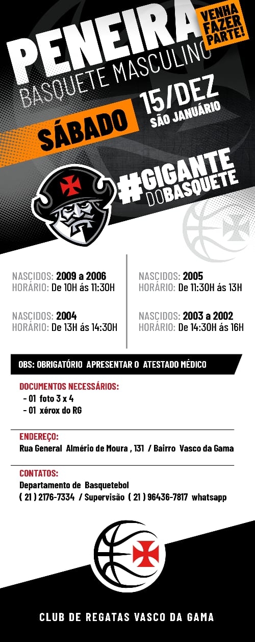 Conhecido como Gigante do Basquete, o Club de Regatas Vasco da Gama vai promover uma peneira masculina no próximo dia 15 de dezembro para nascidos entre 2002 e 2009. O local será o Ginásio de São Januário e alguns documentos obrigatórios são necessários, como: 1 foto 3x4, 1 xerox do RG, além da apresentação de um Atestado Médico.