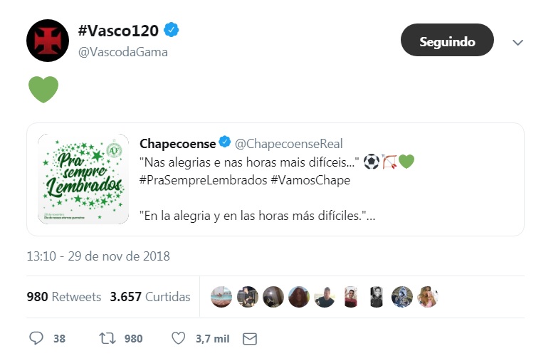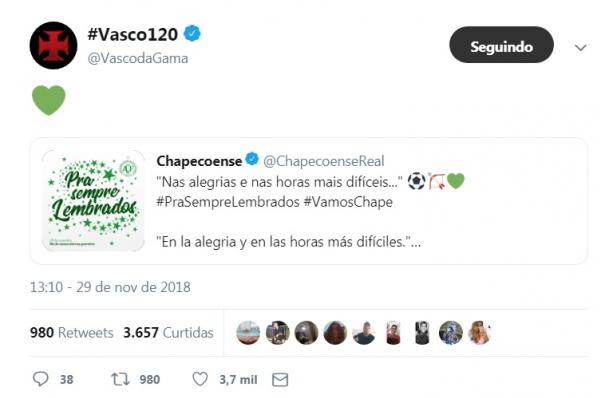 No Twitter, Vasco lembra os 2 anos do acidente que vitimou delegação da Chapecoense