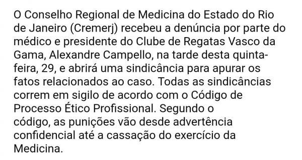 Eis o posicionamento do Conselho Regional de Medicina sobre o episódio com o presidente do Vasco, Alexandre Campello. A denúncia está sob análise #gevas