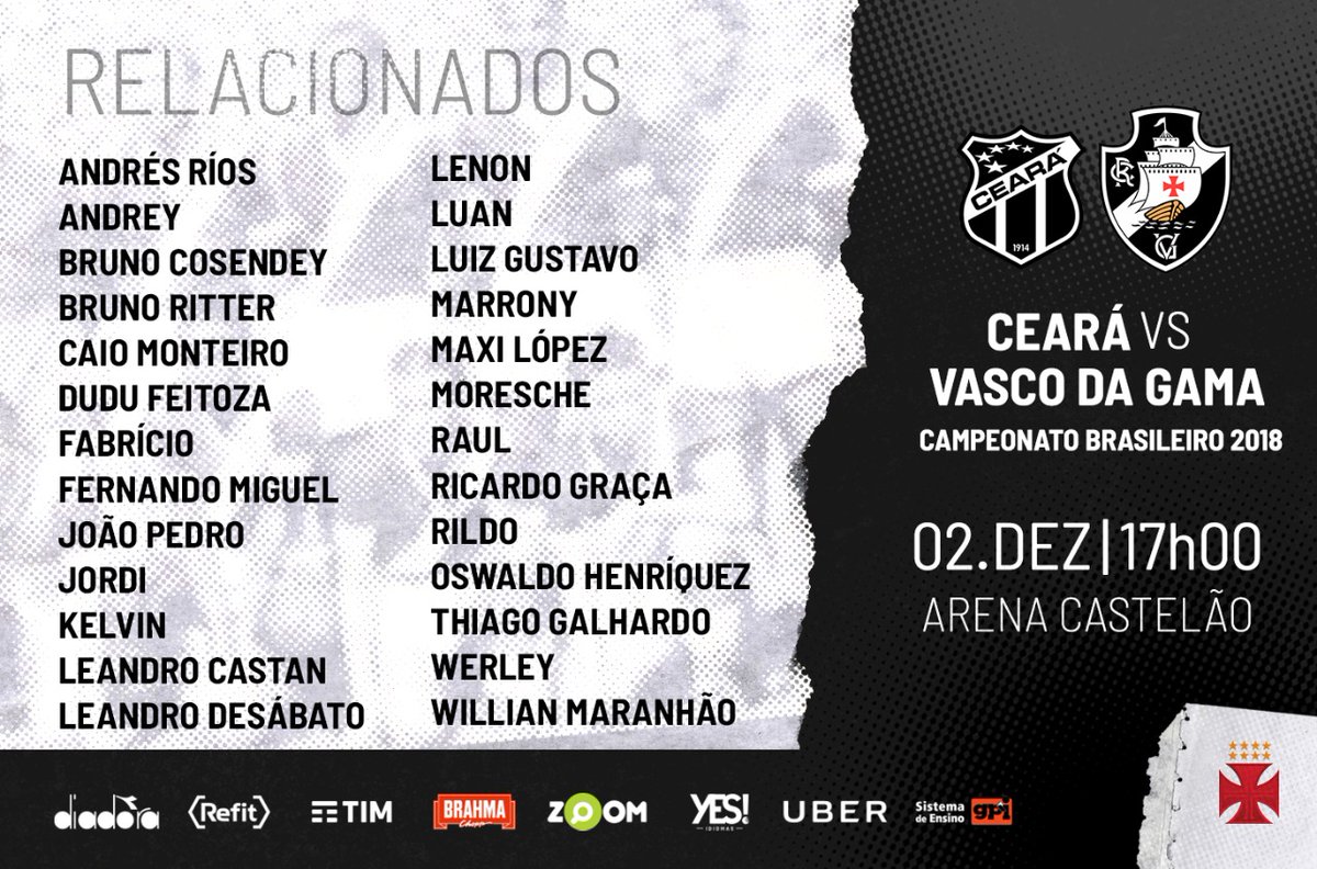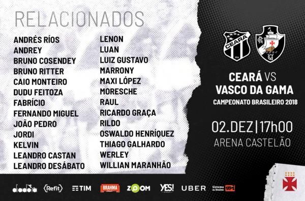 Veja lista oficial dos jogadores do Vasco que viajaram para Fortaleza