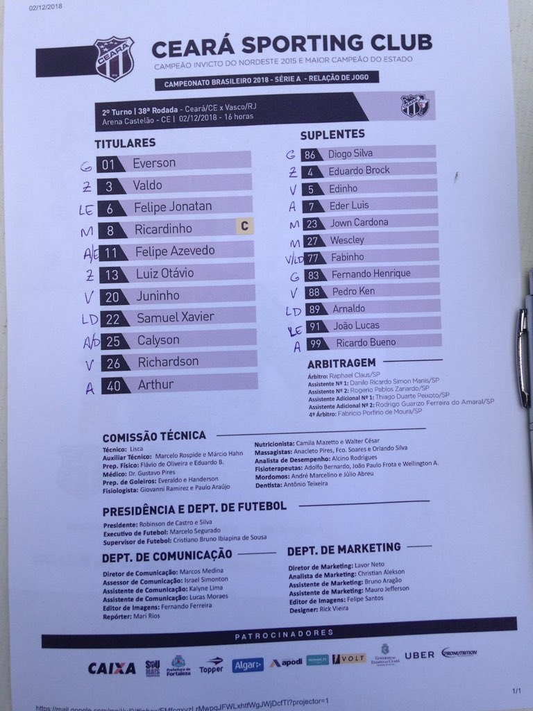 02/12/18 - Palpite NETVASCO: O resultado mais palpitado foi Ceará 1 x 2 Vasco
