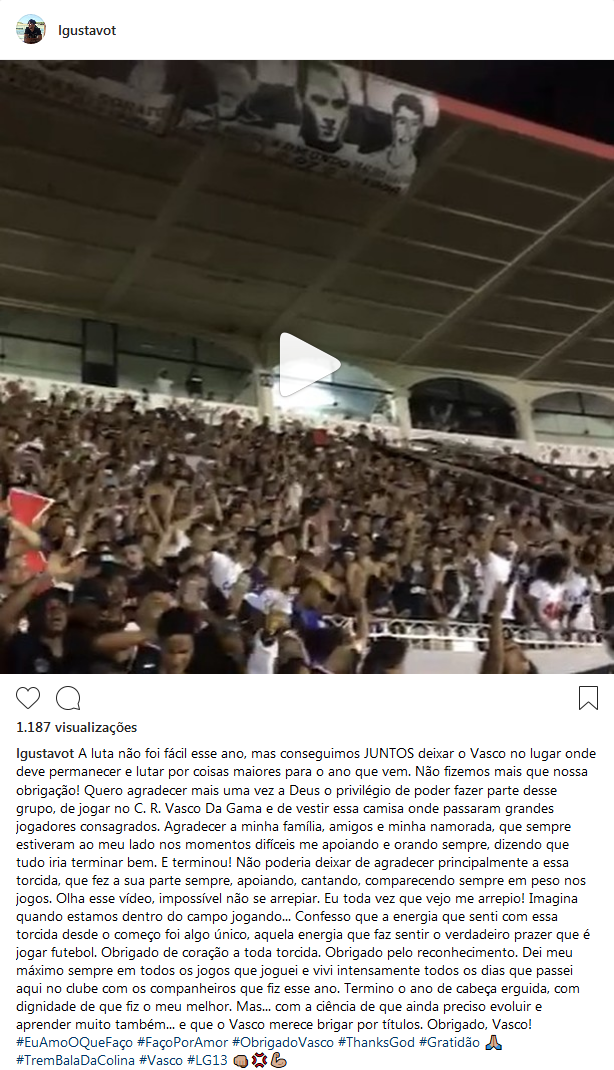 Em rede social, Luiz Gustavo publica agradecimento à torcida do Vasco