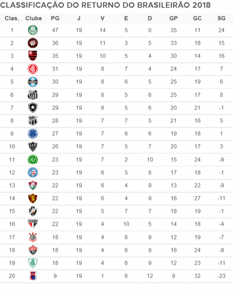 Na parte de baixo, a posição do Corinthians, campeão brasileiro no ano passado, impressiona. O Timão foi o único time no Z-4 do returno a não ser rebaixado para a Série B. Com apenas 18 pontos conquistados, o alvinegro pontou até menos do que o Sport - que caiu - na segunda metade do torneio.