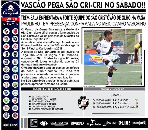 Pré-Mirim: Vasco enfrenta o São Cristóvão neste sábado pelas quartas da Taça Rio do Carioquinha Sub-10