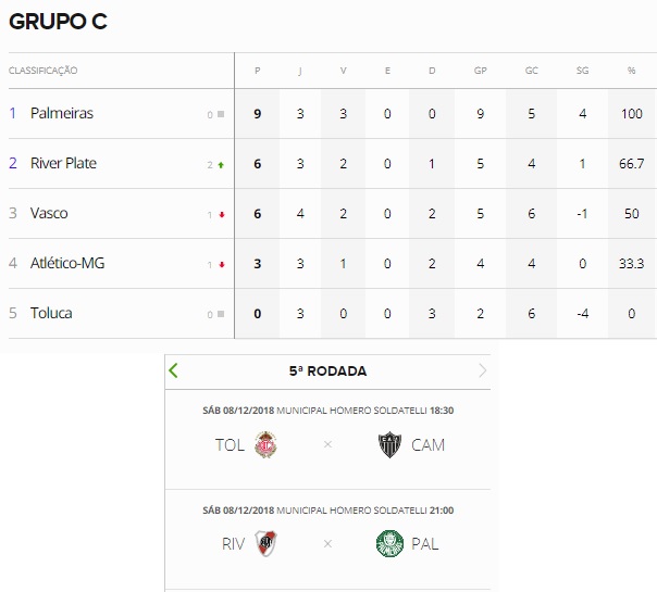 2) No jogo das 21h, o Palmeiras precisa derrotar o River Plate-ARG por 3 ou mais gols de diferença, de forma que o time argentino permaneça empatado com o Vasco em pontos, mas seja ultrapassado por ele no saldo de gols (um empate no saldo de gols ou nos gols pró não favorece o Vasco, que perdeu no confronto direto).