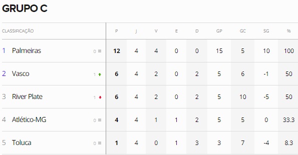 O que parecia quase impossível aconteceu. Depois do Atlético-MG tropeçar contra o Toluca (o time mexicano marcou o gol do empate por 1 a 1 aos 46 minutos do 2º tempo), o Palmeiras, que precisava vencer o River Plate por 3 a 0 para classificar o Vasco, goleou o time argentino por 6 a 0 e garantiu o Gigante da Colina nas quartas de final do torneio. O primeiro tempo terminou 3 a 0; na etapa final, o River teve três jogadores expulsos e o time paulista chegou facilmente à goleada. O Vasco enfrenta o Grêmio na 2ª-feira, com horário ainda a ser definido, mas com transmissão confirmada pelo Sportv.