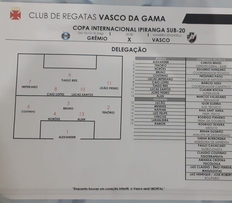 Escalação do #Vasco para enfrentar o @Gremio, na Copa Ipiranga Sub-20: Alexander; Cayo Tenório, Alan, Norões e Coutinho; Bruno, Caio Lopes, Lucas Santos; João Pedro, Lucas Imperiano e Tiago Reis. Técnico: Marcos Valadares. @OficialFGF @emanuelcarimbou