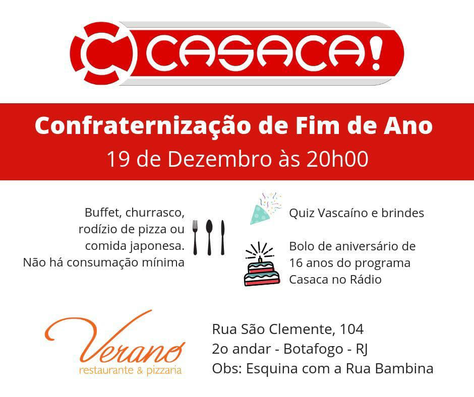 Casaca fará confraternização de fim de ano no dia 19/12