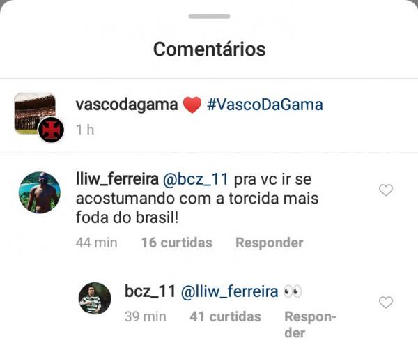 No Instagram, Bruno César responde a seguidor que exaltou torcida do Vasco