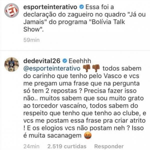 A informação foi divulgada com apenas esse recorte da entrevista e chegou rápido aos torcedores vascaínos, que logo trataram de possuir rancor e mágoas do antigo jogador do clube. Em seu Instagram, Dedé tentou se explicar: