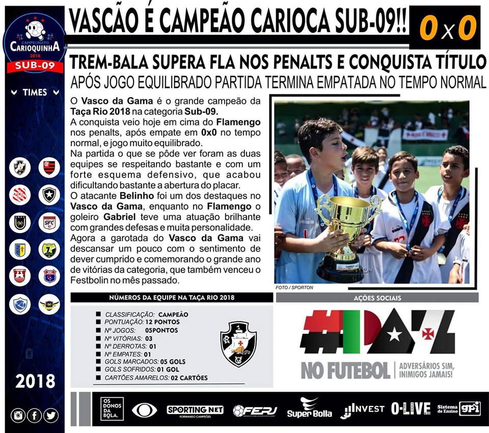 O Vasco conquistou mais um título neste sábado (15/12). A equipe Sub-9 do Gigante da Colina venceu o Flamengo nos pênaltis por 7 a 6, no Espaço Américas e levou o título da Taça Rio. No tempo normal, o empate 0 a 0 persistiu.