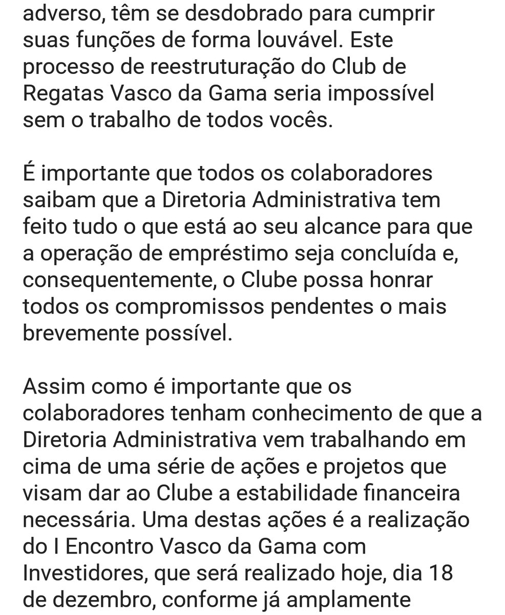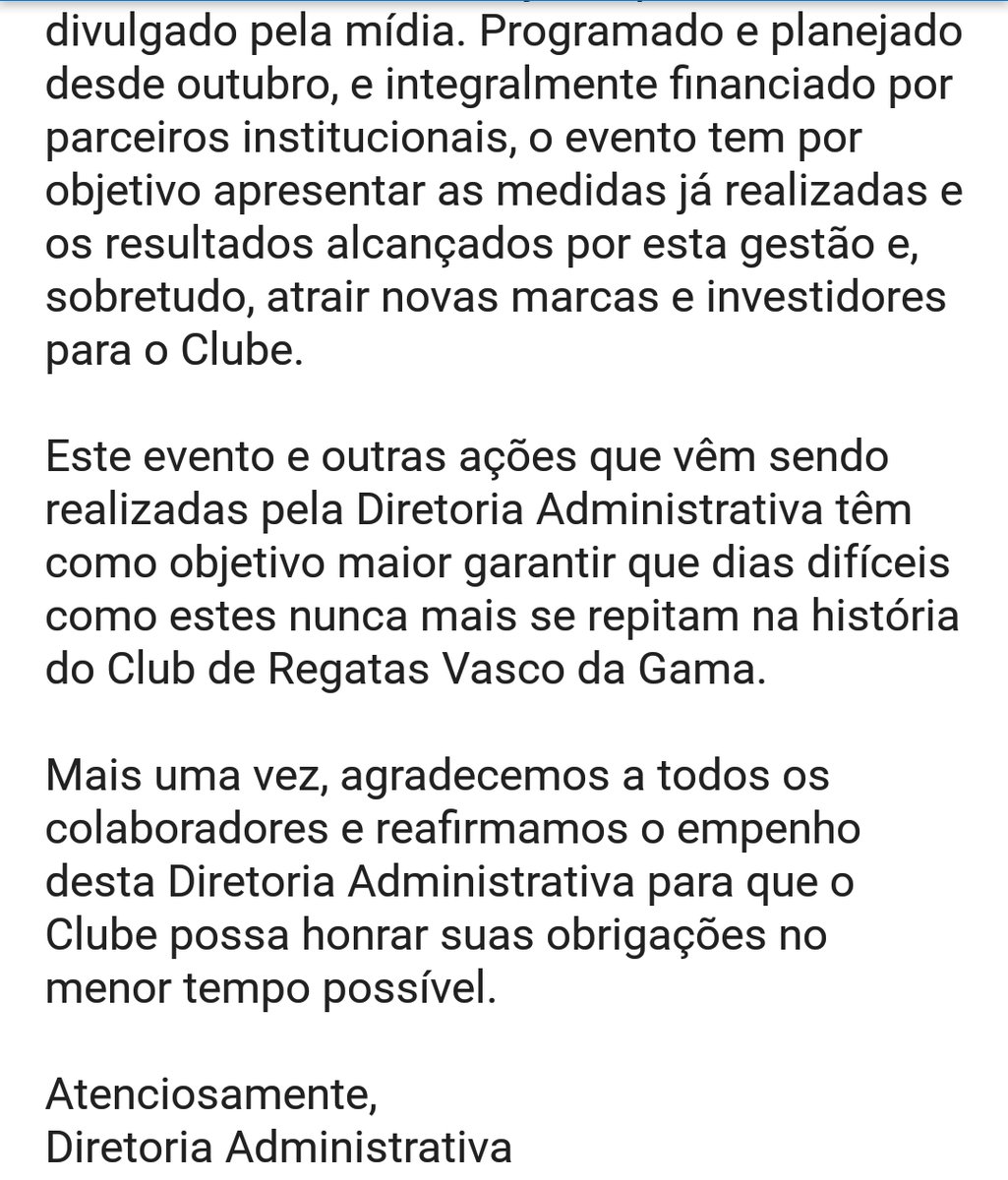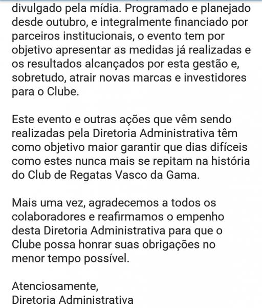 Diretoria do Vasco emite comunicado aos funcionários do clube no dia em que realizará evento para investidores. Salários estão atrasados. Somando dívidas da atual diretoria e da anterior, são cinco pagamentos em aberto.