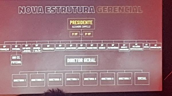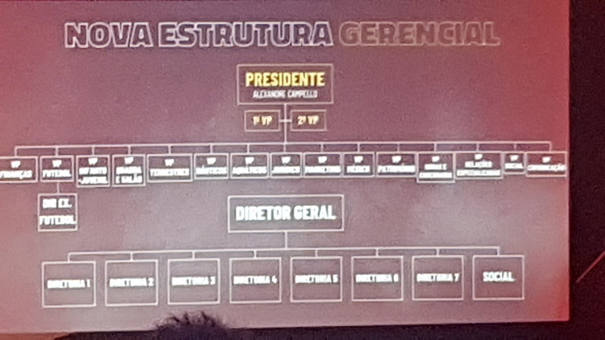 Adriano Mendes mostra a proposta de nova estrutura gerencial, com a criação do cargo de diretor geral: "Os VPs, mesmo o presidente, não estão disponíveis em tempo integral". #gevas