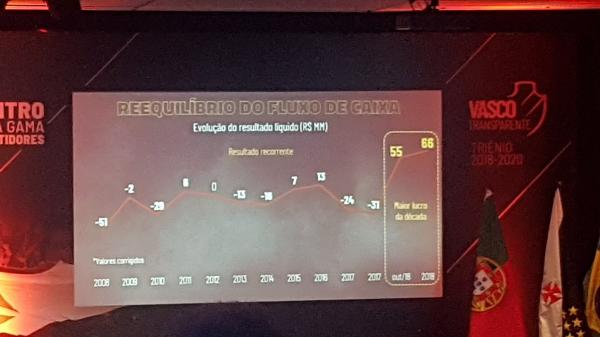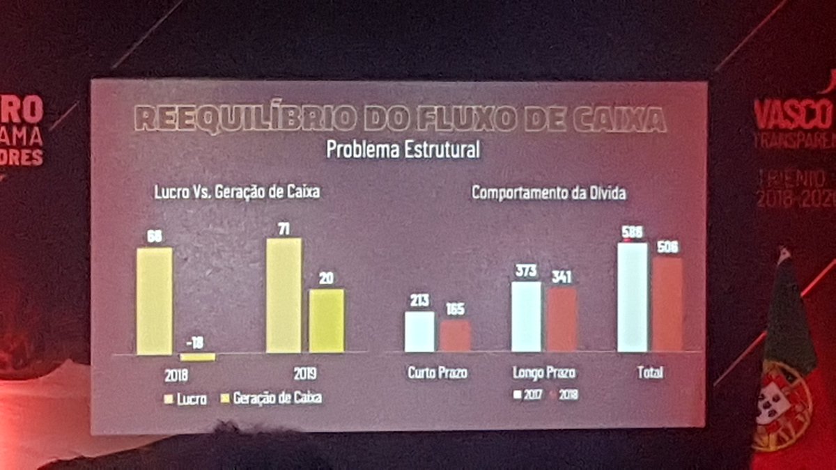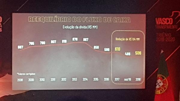 Evolução da dívida do Vasco. Adriano calcula redução de R$ 104 milhões em 2018, chegando a R $ 506 milhões. #gevas