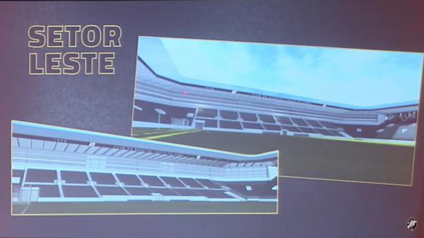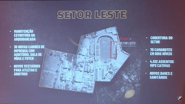Projeto para o Setor Leste. Cobertura, manutenção da arquibancada, camarotes e assentos VIPs. 35 novas cabines de imprensa, com auditório, além de novos vestiários e 70 camarotes.