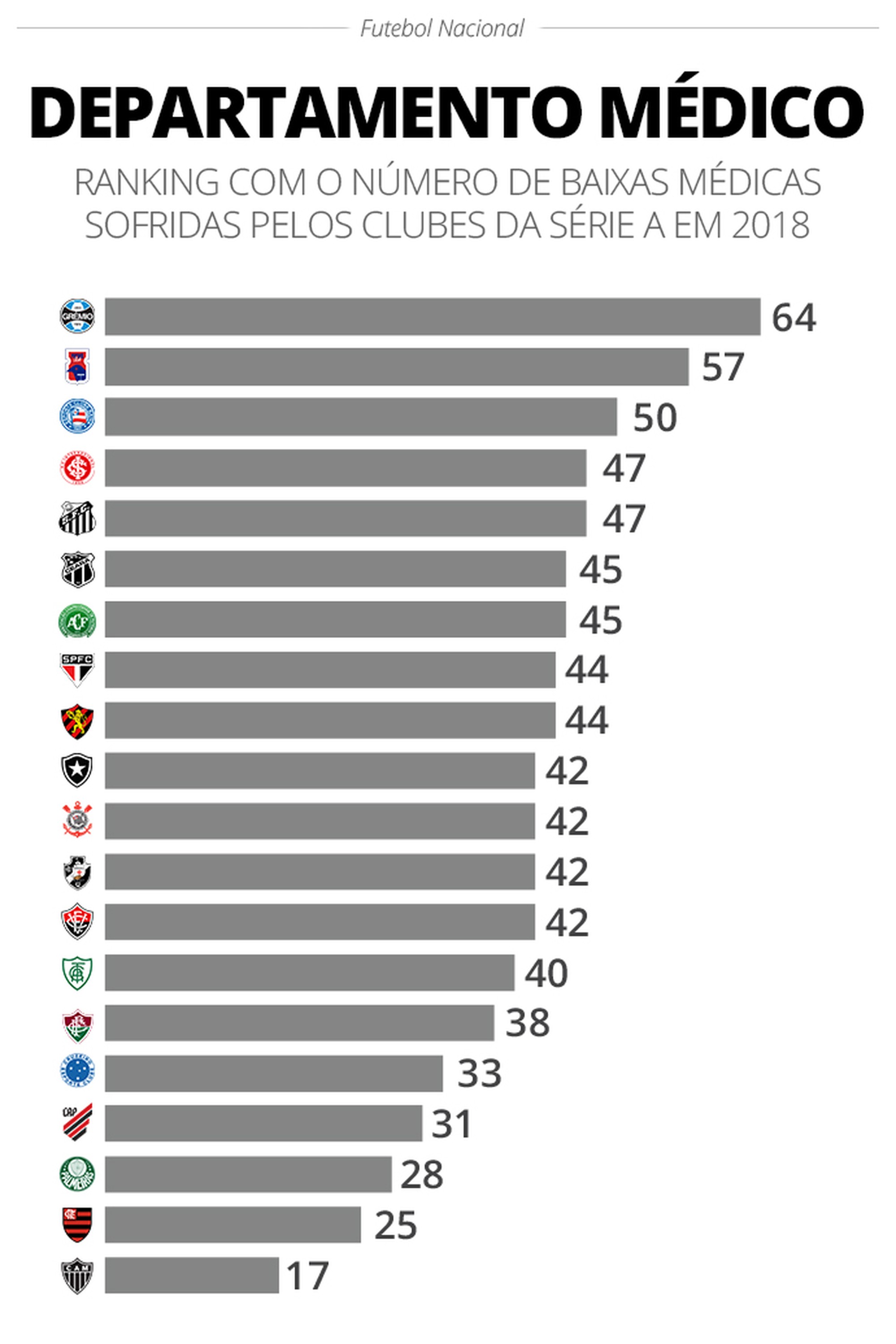 A perda de jogadores para o departamento médico influi diretamente na quantidade de opções para cada partida na temporada e mesmo nos resultados obtidos em campo. Por tudo isso, o GloboEsporte.com acompanhou durante a temporada 2018 com a equipe Espião Estatístico e a ajuda dos setoristas dos 20 clubes que disputaram a Série A do Brasileirão e informações dos sites oficiais cada lesão que desfalcava as equipes jogo após jogo. Foram desconsiderados da lista os atletas poupados por desgaste físico ou com problemas fisiológicos.
