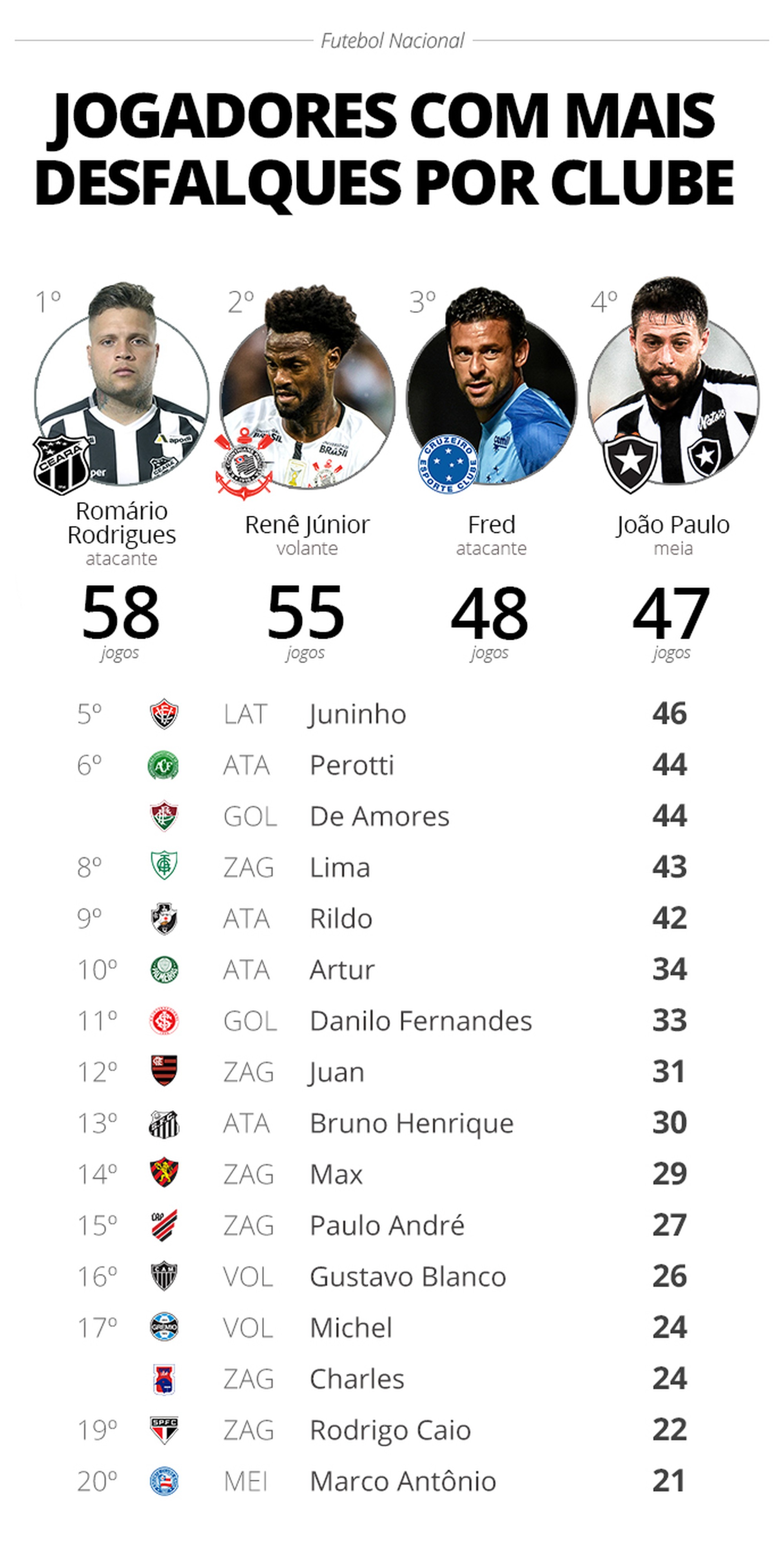 O jogador que mais desfalcou um time da Série A neste ano é do Ceará: Romário Rodrigues. O atacante do Vovô teve uma lesão séria no joelho no início do ano e ficou afastado até julho. Depois disso, ele ainda sofreu outra contusão em setembro. No total, foram 58 jogos fora.