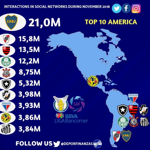 📲⚽ ¡Los 10 clubes de América con más interacciones en redes sociales durante noviembre 2018! (#tw #fb #ig)