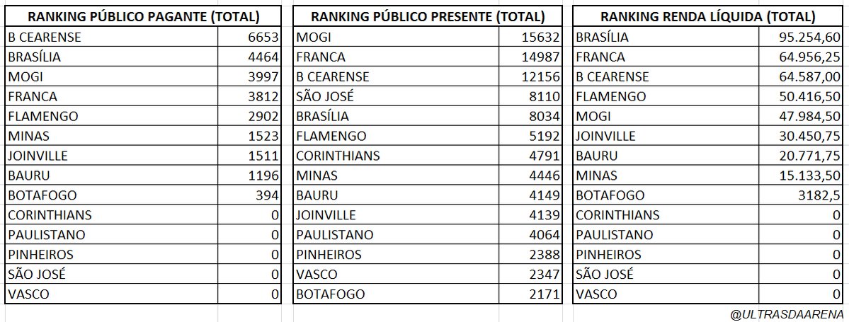 A capital paulista, tal como São José dos Campos, não registrou a movimentação de nenhum real de bilheteria. Todos os jogos tiveram entrada gratuita. O mesmo ocorreu com o Vasco, no Rio. #NBB #DataUltras