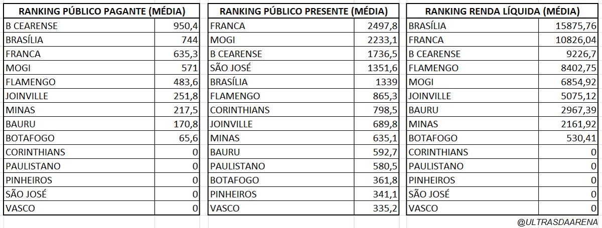 O Basquete Cearense também apresentou a melhor média de público pagante, com 950,4 pagantes/jogo. O Franca teve a melhor média de público presente, com 2497,8 presentes/jogo. Já Brasília apresentou a maior média de renda líquida por jogo, com R$ 15.875,76. #NBB #DataUltras