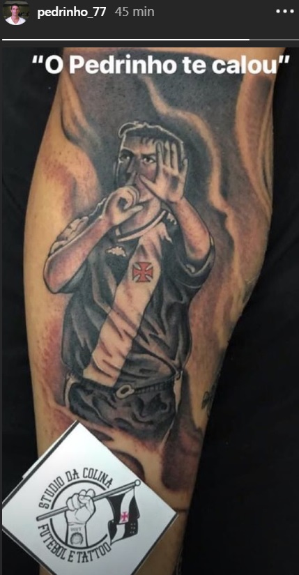 O famoso gesto de Pedrinho mandando a torcida do Flamengo calar a boca, no 5 a 1 da Taça Guanabara 2000, virou tatuagem, feita pelo Studio da Colina. O trabalho foi compartilhado pelo próprio ídolo em seu Instagram. Confira: