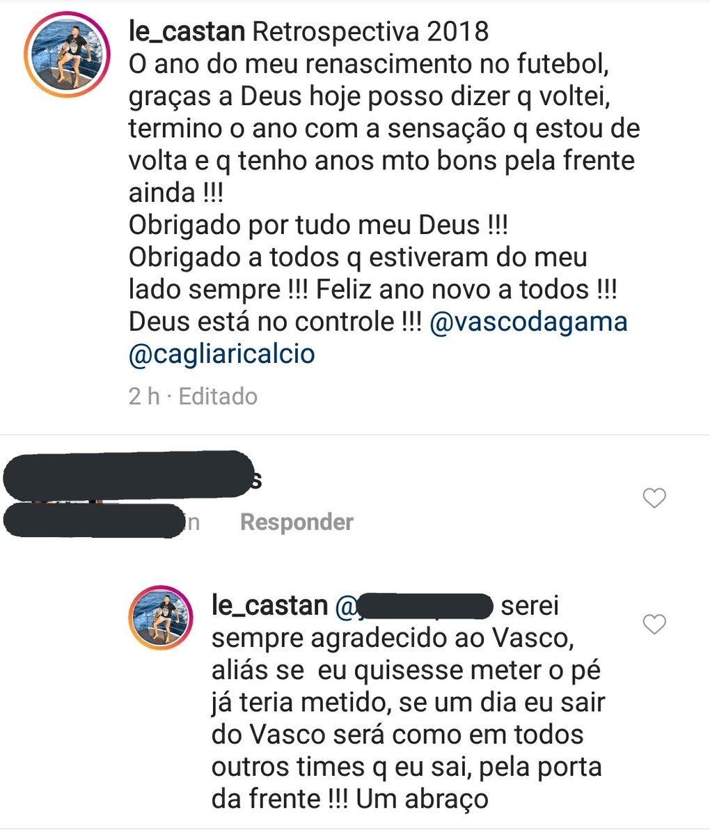 "Serei sempre agradecido ao Vasco, se eu quisesse meter o pé já teria metido. Se um dia eu sair do Vasco, vai ser como em todos os outros times que eu saí, pela porta da frente. Um abraço."