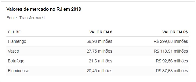Já os elencos de Vasco, Flu e Bota somados valem 69,8 milhões (R$ 299,11 milhões).