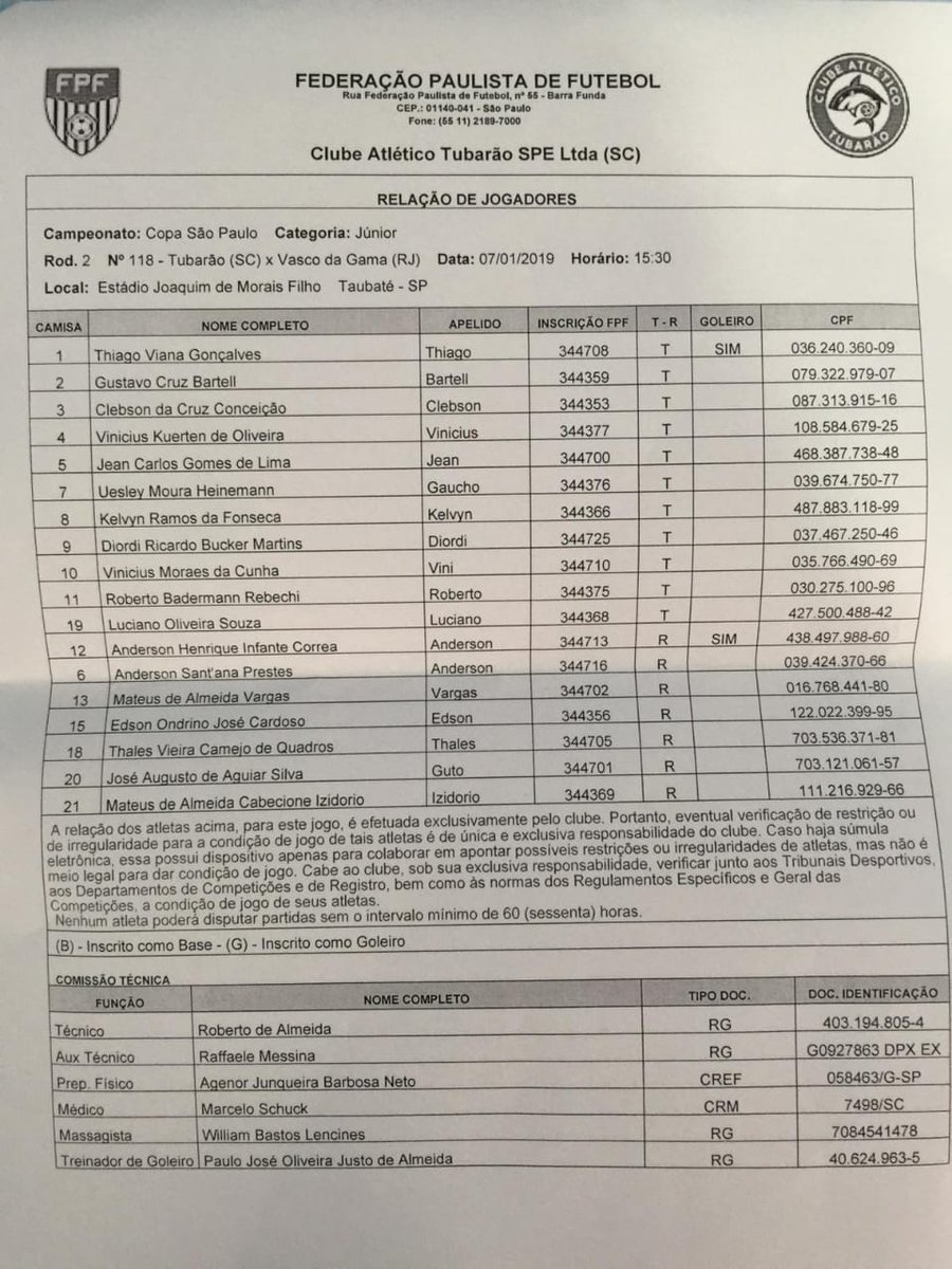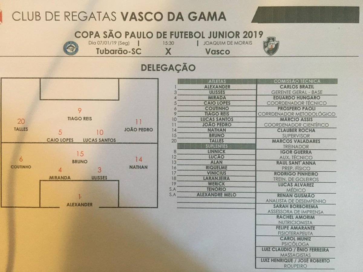 Vasco escalado para enfrentar o Tubarão, pela segunda rodada do grupo 27 da Copinha. Mesma equipe da estreia. #gevas