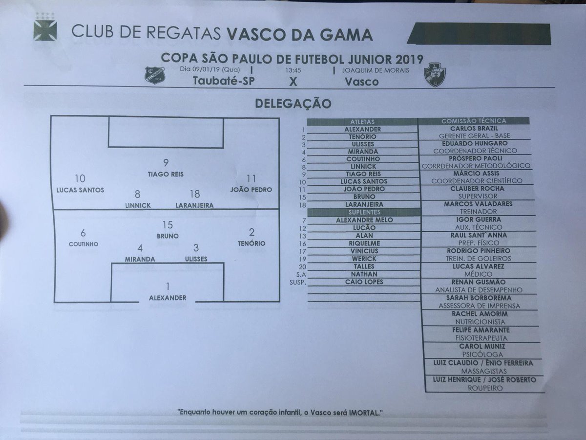 A escalação do Vasco na Copinha para enfrentar o Taubaté, às 13h45. Nathan e Talles poupados, Caio Lopes suspenso. Entram Tenório, Laranjeira e Linnick. #gevas