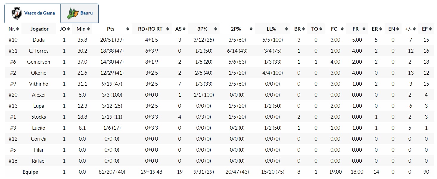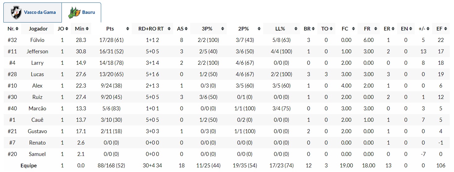 Apesar de ter o cestinha do jogo, Duda (com 20 pontos), o Vasco não soube manter o equilíbrio ao longo de toda a partida. Mesmo em casa, a equipe do técnico Alberto Bial viu as boas atuações do americano Larry (14 pontos), Fúlvio (17 pontos e oito assistências) e Jefferson (16 pontos) para sacramentar a vitória de Bauru - a partir dos últimos dois quartos.