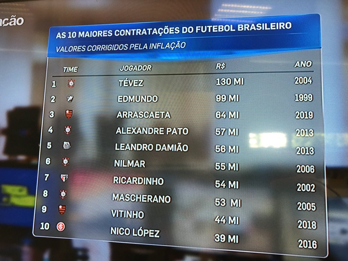 Top-10 de contratações mais caras do futebol brasileiro com os valores corrigidos (via @rodrigocapelo no Redação @SporTV)