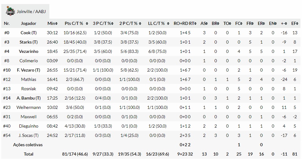Após uma sequência negativa de cinco derrotas, o Vasco, enfim, voltou a vencer no Novo Basquete Brasil (NBB). A vítima foi o Joinville, adversário direto na briga pela 12ª colocação, a última posição dentro da zona de classificação aos playoffs. Com o triunfo por 92 a 81 no Centreventos Cau Hansen, em Joinville, o Cruz-Maltino deixou o 13º lugar, trocando de posição com o rival. Apesar da derrota da sua equipe, Vezarinho deixou a quadra como cestinha da partida com 25 pontos. Pelo lado do Vasco, Stocks (17 pontos), Caio Torres (17), Duda (16) e Vithinho (14) foram os maiores pontuadores.