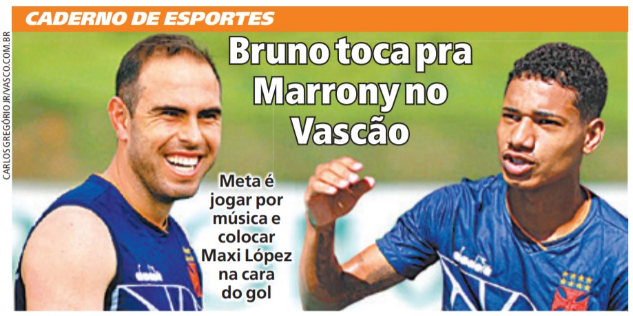 O jornal Meia Hora, do Rio de Janeiro, destaca em sua capa a dupla vascaína Bruno (César) e Marrony. "Meta é jogar por música e colocar Maxi López na cara do gol", diz a legenda.