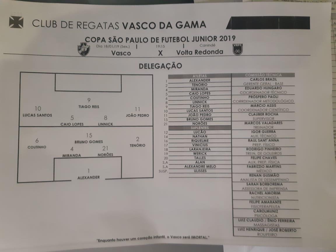 Vasco escalado para enfrentar o Volta Redonda, no Estádio do Canindé, pelas quartas de final da Copa São Paulo: Alexander; Cayo Tenório, Miranda, G. Norões e Coutinho; Bruno Gomes, Linnick e Caio Lopes; João Pedro, Lucas Santos e Tiago Reis. Téc: Marcos Valadares. #Copinha50