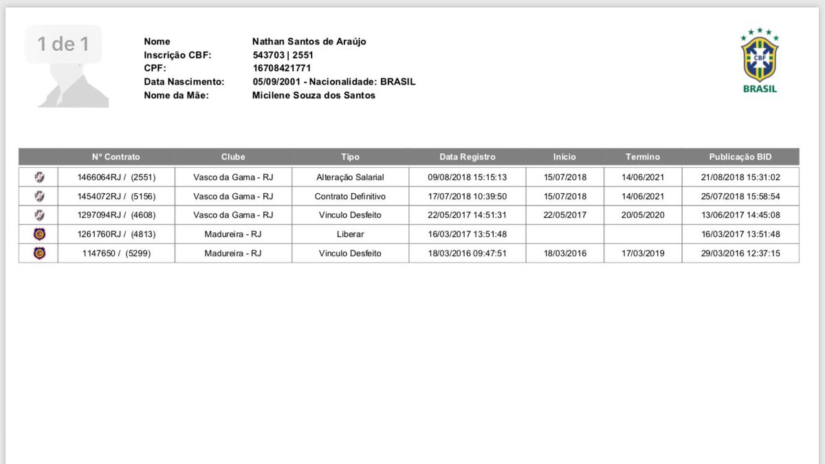 Este é o documento sobre a carreira de Nathan, que comprova que não há vínculo nenhum com a Portuguesa, como informei anteriormente em apuração feita com o Vasco. Ou seja: para o clube, vale o que está no papel. #OsDonosDaBola @EdilsonNaRede