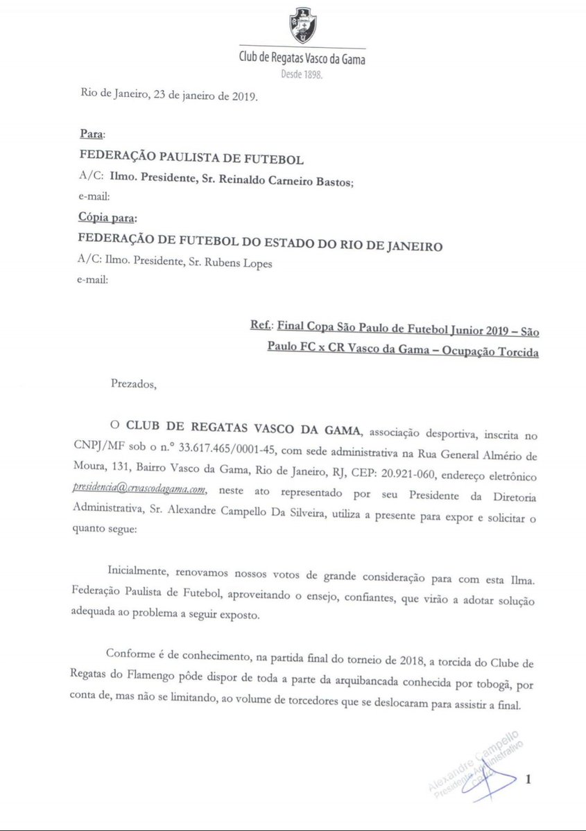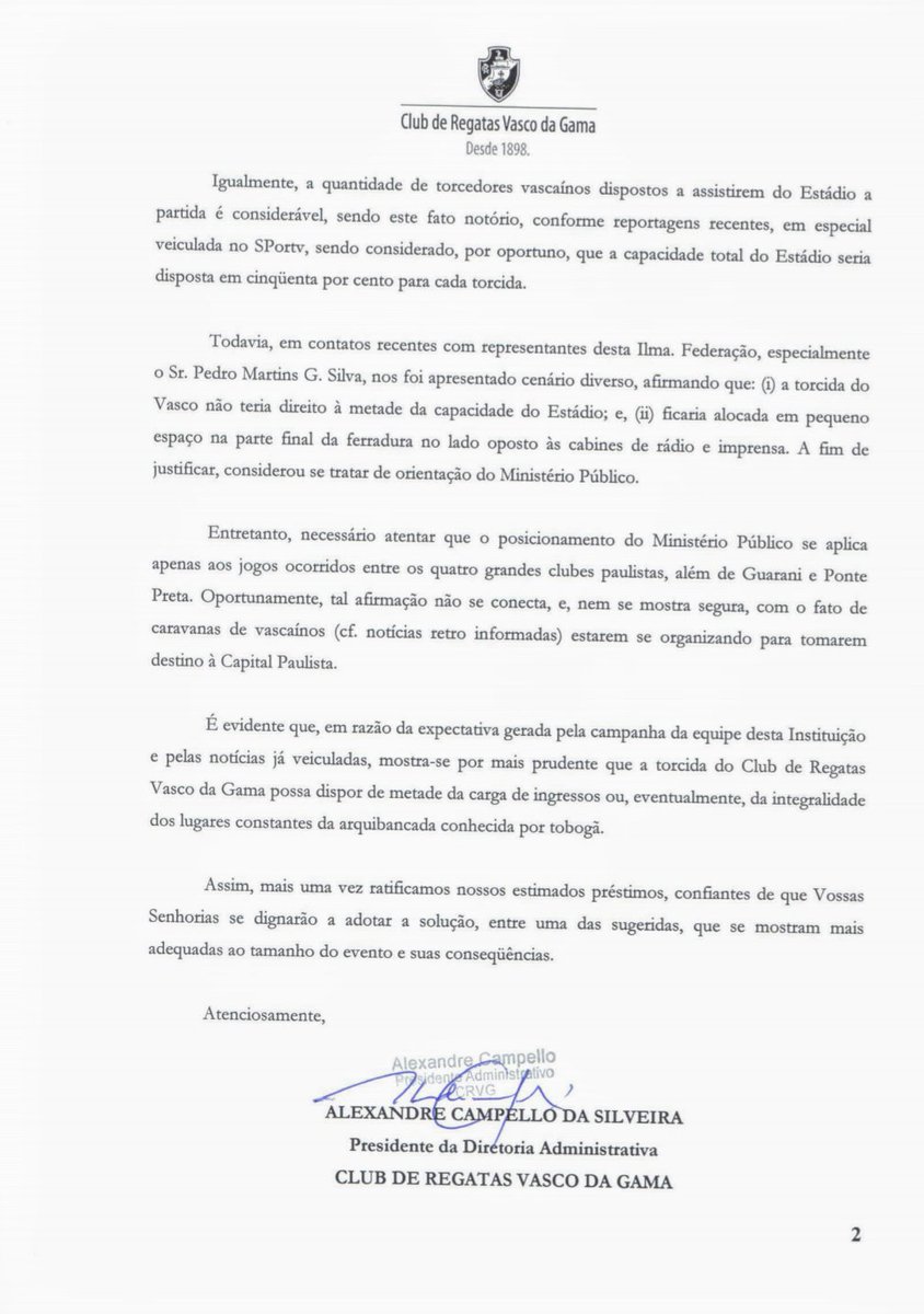 Vasco tenta junto a Federação Paulista de Futebol aumentar a carga de ingressos reservada para os vascaínos - 2 mil. O time disputa na sexta-feira a final da Copinha contra o São Paulo, no Pacaembu.
