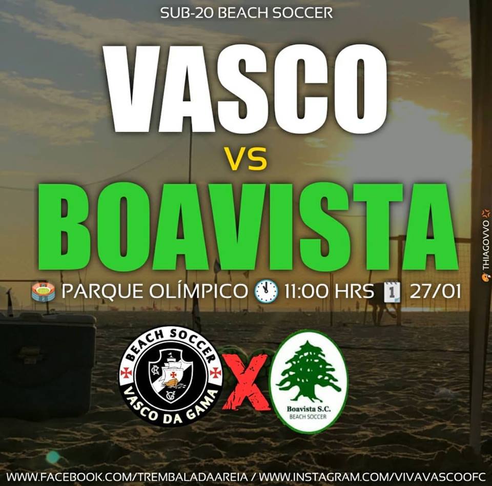 Neste domingo às 11:00 horas da manhã, no Parque Olímpico na Barra da Tijuca, a equipe Sub-20 do Vasco Beach Soccer, enfrentará a equipe do Boavista em um Amistoso, o duelo será uma preliminar do jogo da Seleção Brasileira, que marcará a despedida da Lenda Jorginho da Amarelinha.
